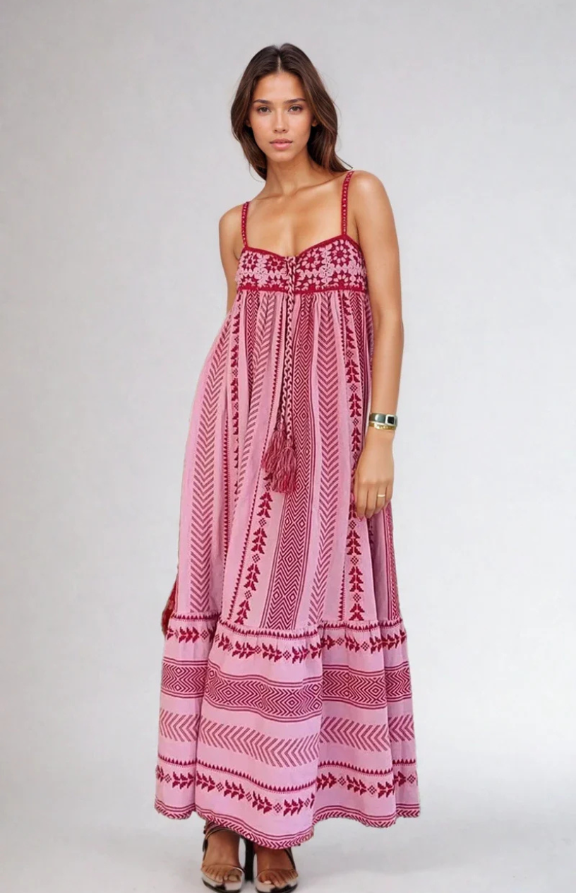 Rochia Bohemian Breeze Maxi este o fuziune uimitoare de farmec liber și stil fără efort. Proiectată cu o talie empire delicată, aceasta prezintă detalii brodate intricate care adaugă o notă de frumusețe artizanală. Bretelele reglabile tip spaghetti oferă o potrivire confortabilă, în timp ce fusta evazată, în straturi creează o silhouette grațioasă și visătoare. Un detaliu cu fundiță la bust adaugă un element boho-chic, făcând această rochie un must-have pentru orice garderobă.